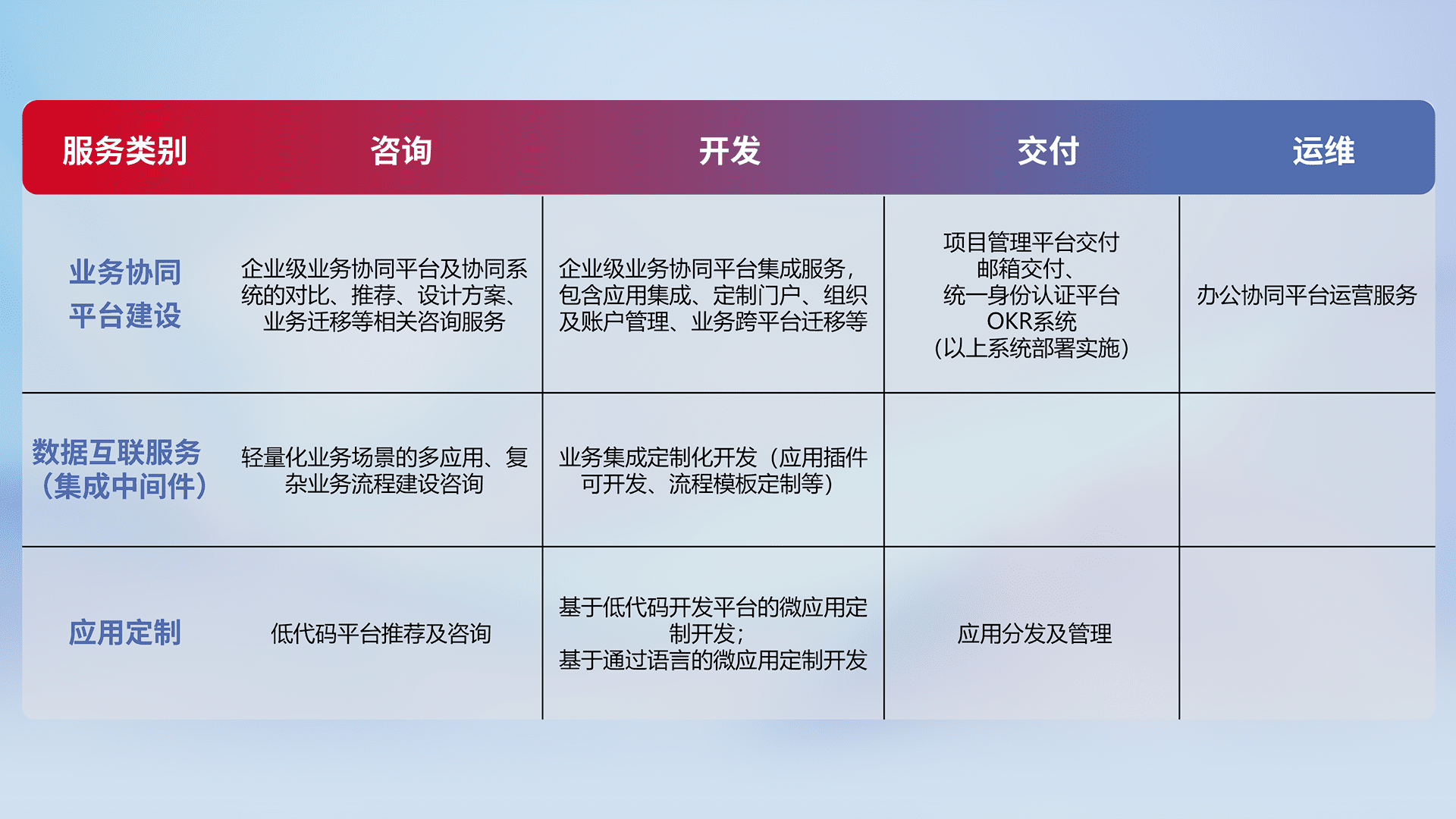 针对钉钉、、、企微、、、IDaas等平台级产品提供产品的规划、、、、方案、、交付、、、、定制化开发等服务,,,实现如统一协同办公、、、智能客户服务、、混合会议管理、、智能数据查询、、、、等业务场景,,,,实现数字化转型。。。。